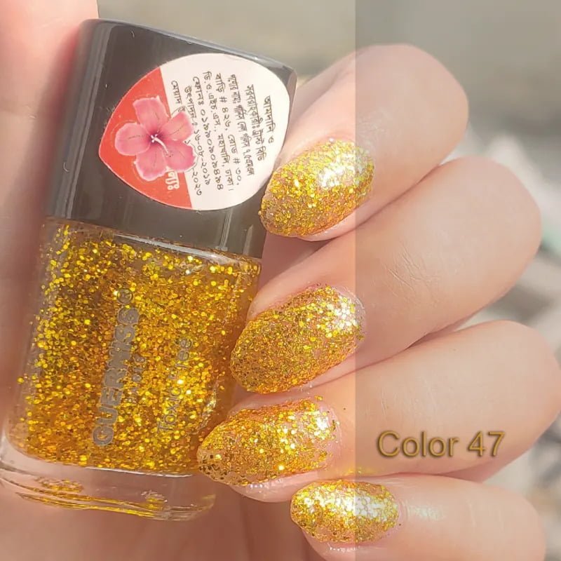 We have many nail polish colors, featuring from white, green, yellow, black, etc. Our nail paints also have glitters.
